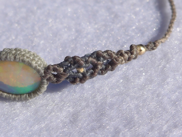 ブルーグリーン斑が輝くオパールをマクラメ編みでブレスレットにしました。