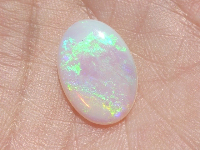 重さ8.09ct 大きさ16×14×5.5mm オーバル形オーストラリア、南オーストラリア州産 ホワイトオパール赤斑メインに緑や青斑が輝くオパールです。 アイシーホワイト色の…