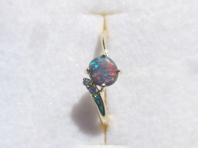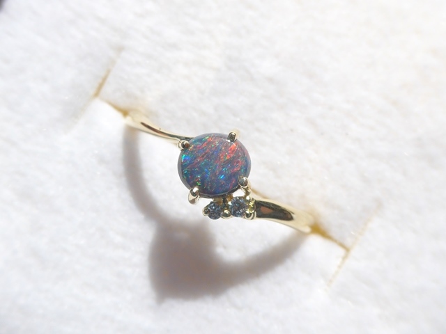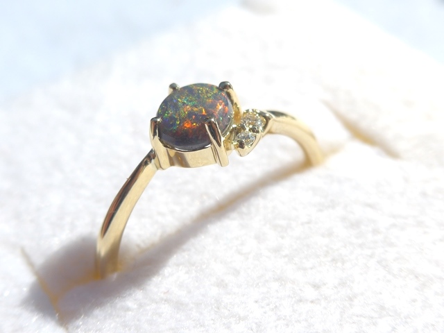 メレダイヤを2石、オパールは斜めに配し、少し動きのあるデザインに…