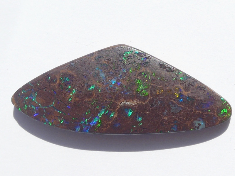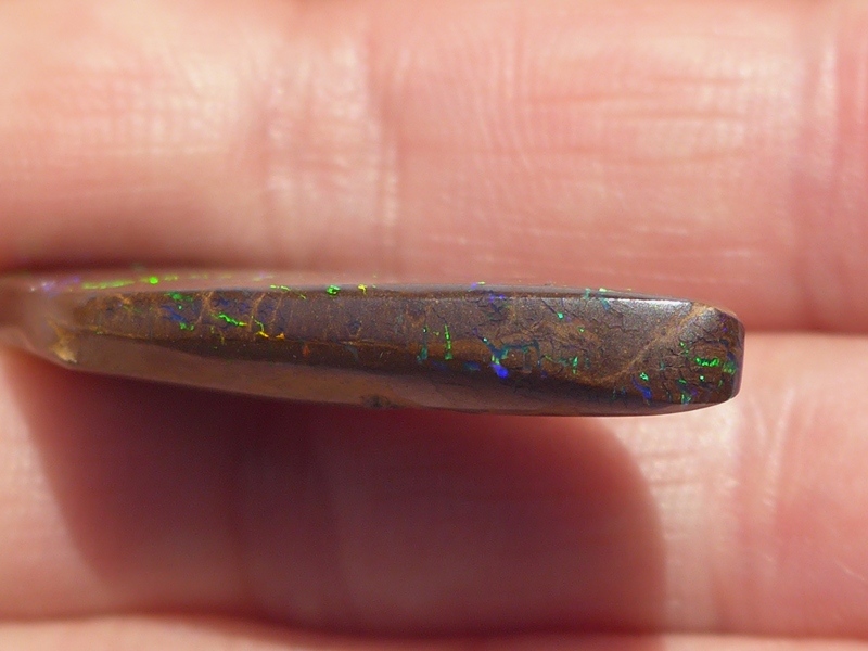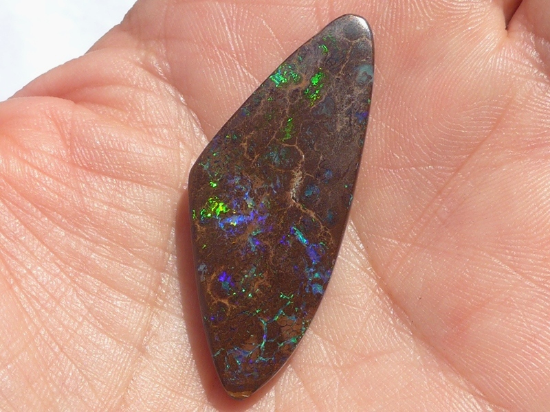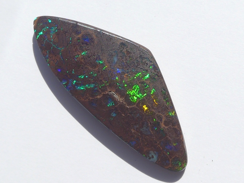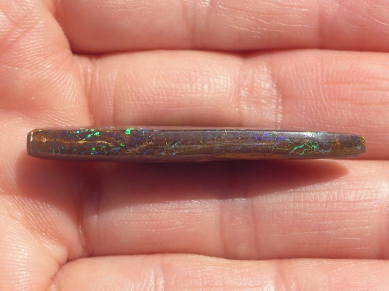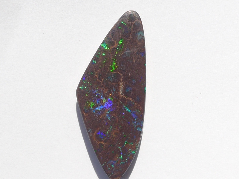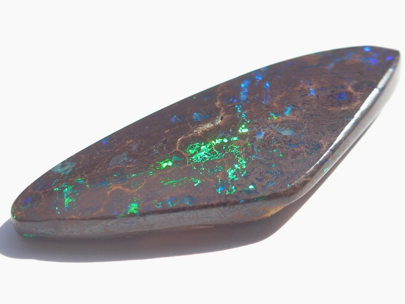 重さ4.13ct 大きさ15×10×3mm フリーシェイプオーストラリア、クイーンズランド州産ボルダーオパール青と緑斑メインに光るオパールです。あちこちで光る小粒の斑の発色が良…