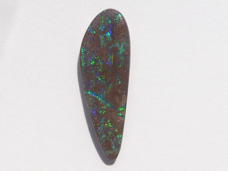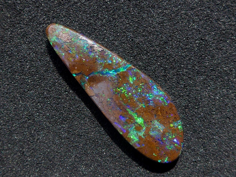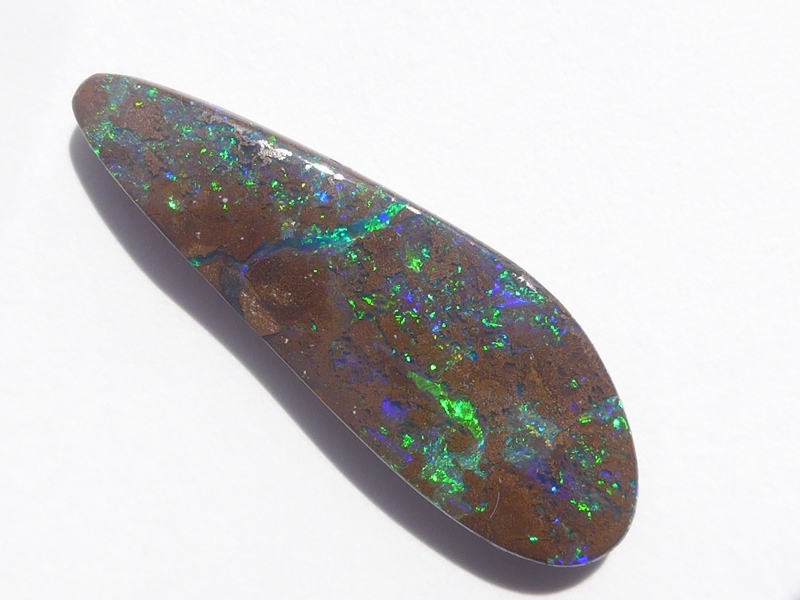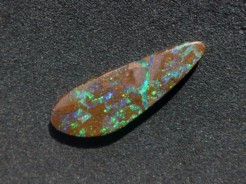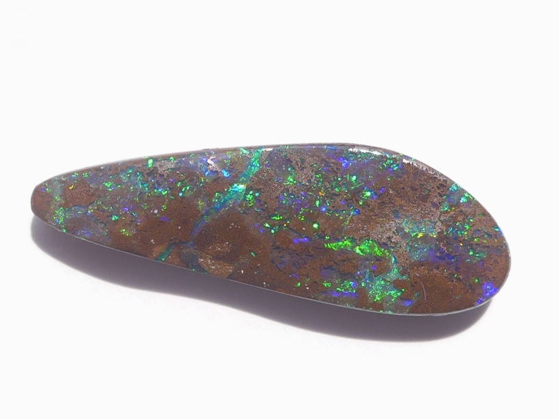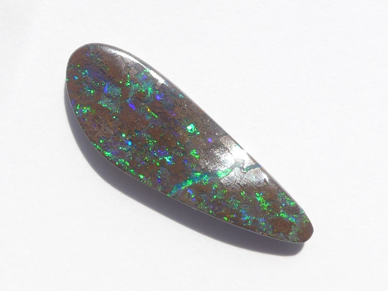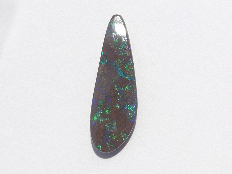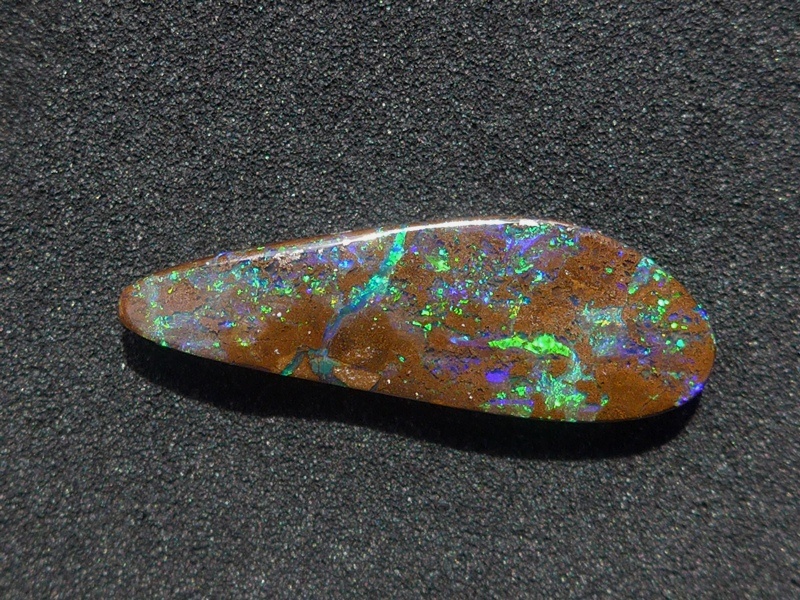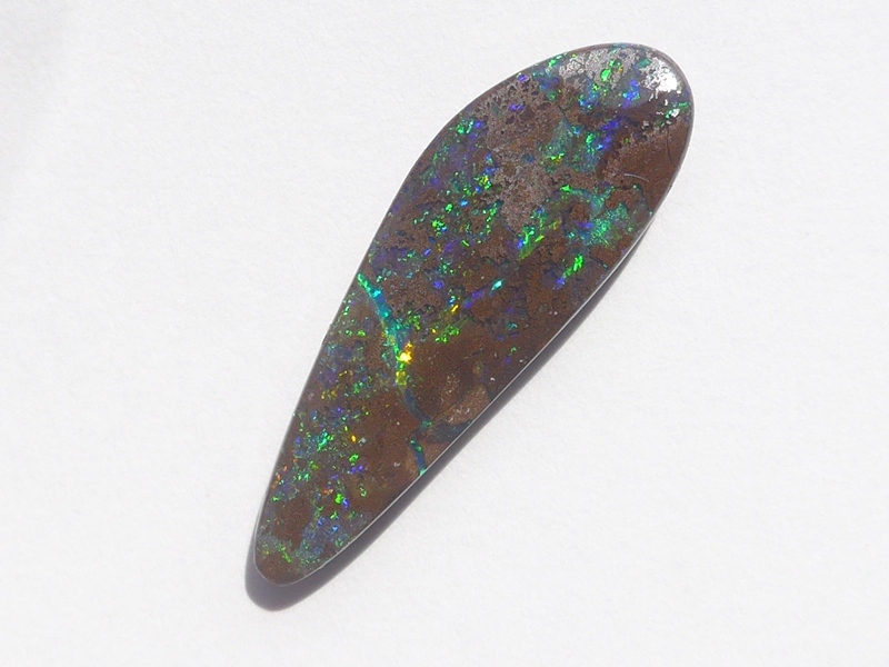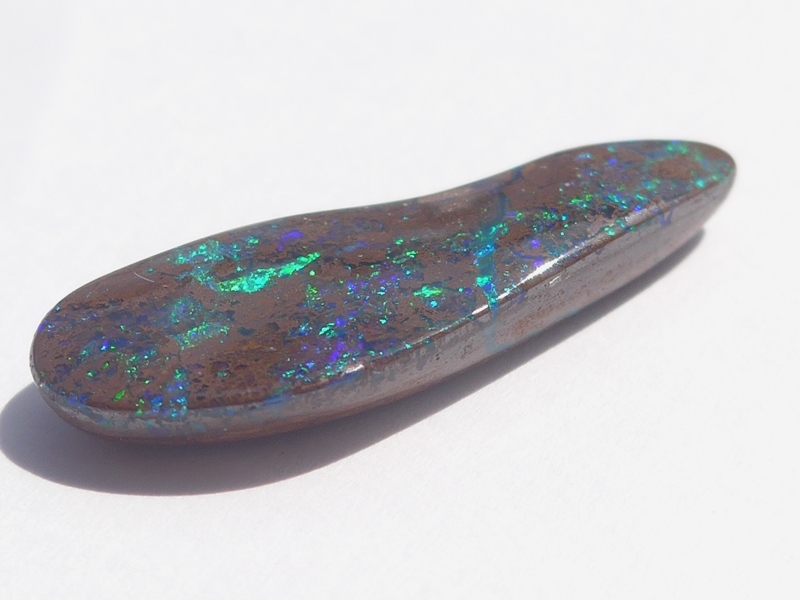重さ3.85ct 大きさ20.5×8×3mm フリーシェイプオーストラリア、クイーンズランド州産 ボルダーオパール赤や青、緑とカラフルな色が輝くオパールです。 鉄鉱石の母岩の…