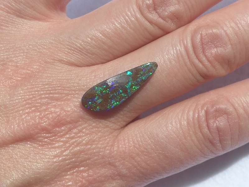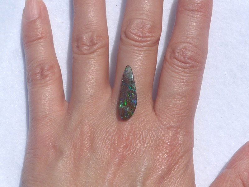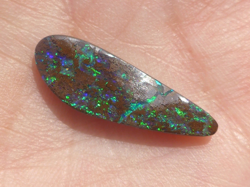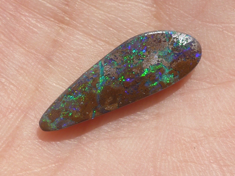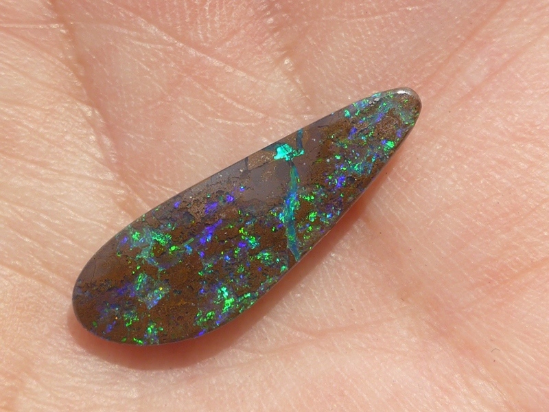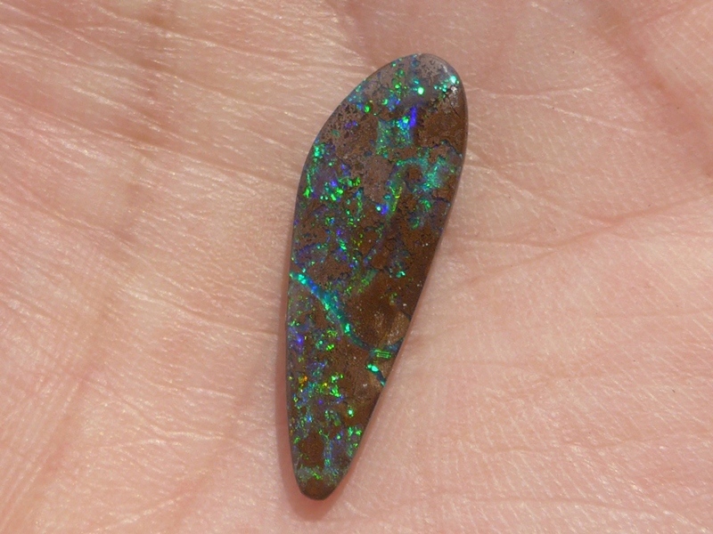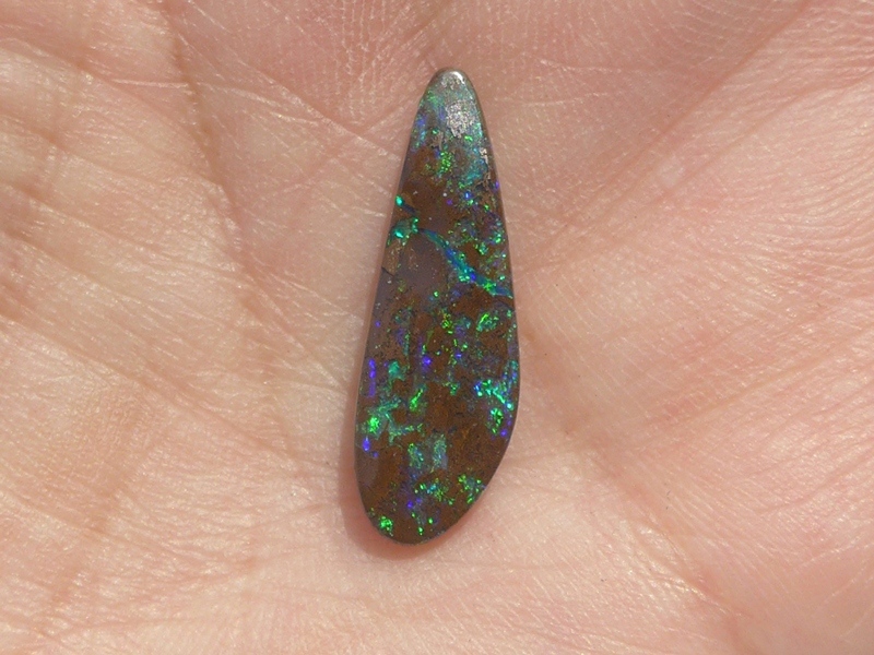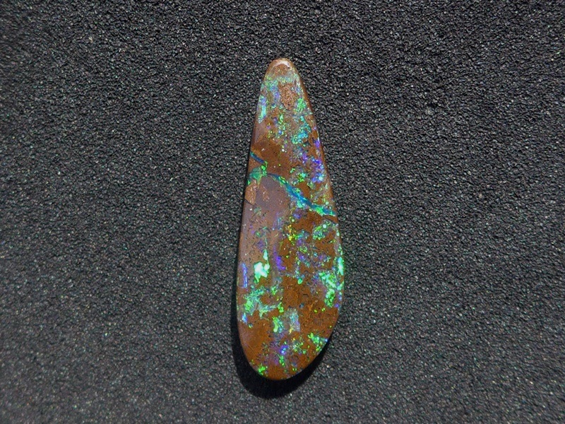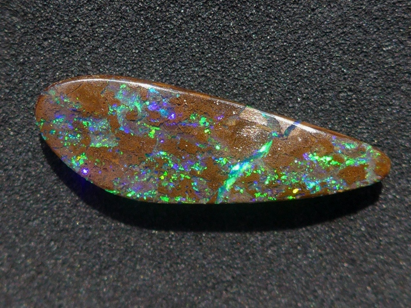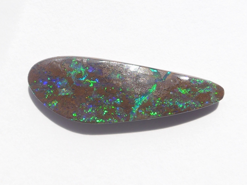 重さ3.85ct 大きさ20.5×8×3mm フリーシェイプオーストラリア、クイーンズランド州産 ボルダーオパール赤や青、緑とカラフルな色が輝くオパールです。 鉄鉱石の母岩の…