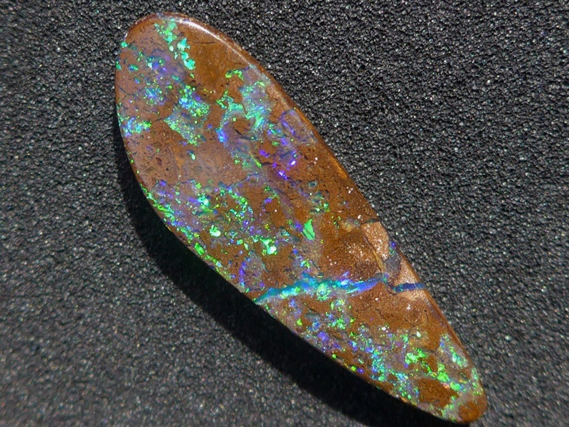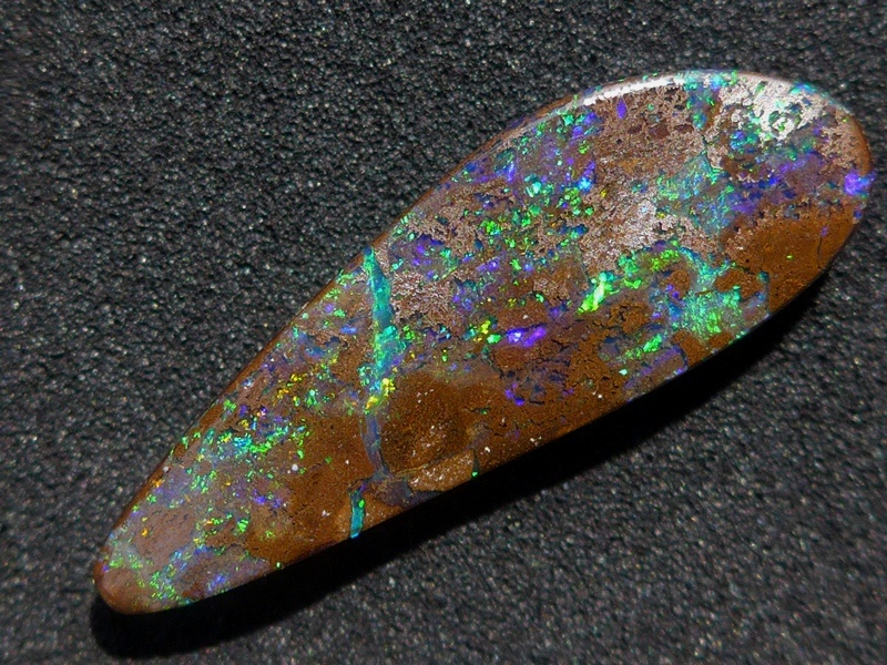 重さ5.80ct 大きさ20×10×4mm オーバル形オーストラリア、クイーンズランド州産 ボルダーオパール赤や青、緑とカラフルな色が輝くオパールです。 こちらも鉄鉱石の母岩の…
