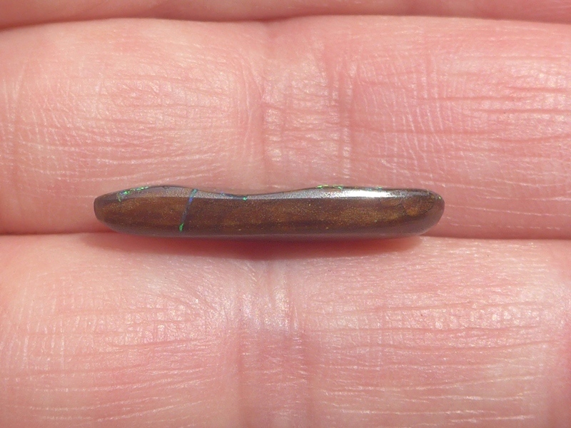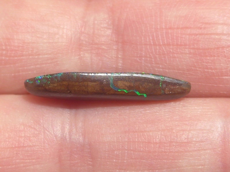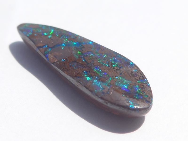 重さ4.40ct 大きさ16×8×3mm フリーシェイプオーストラリア、クイーンズランド州産ボルダーオパール青斑が輝くオパールです。表面がほぼオパール層となっています。インディ…