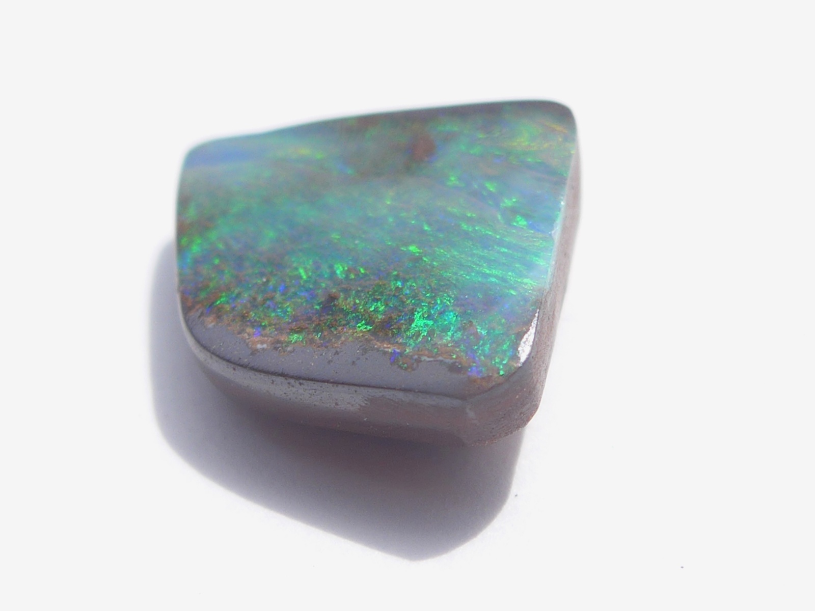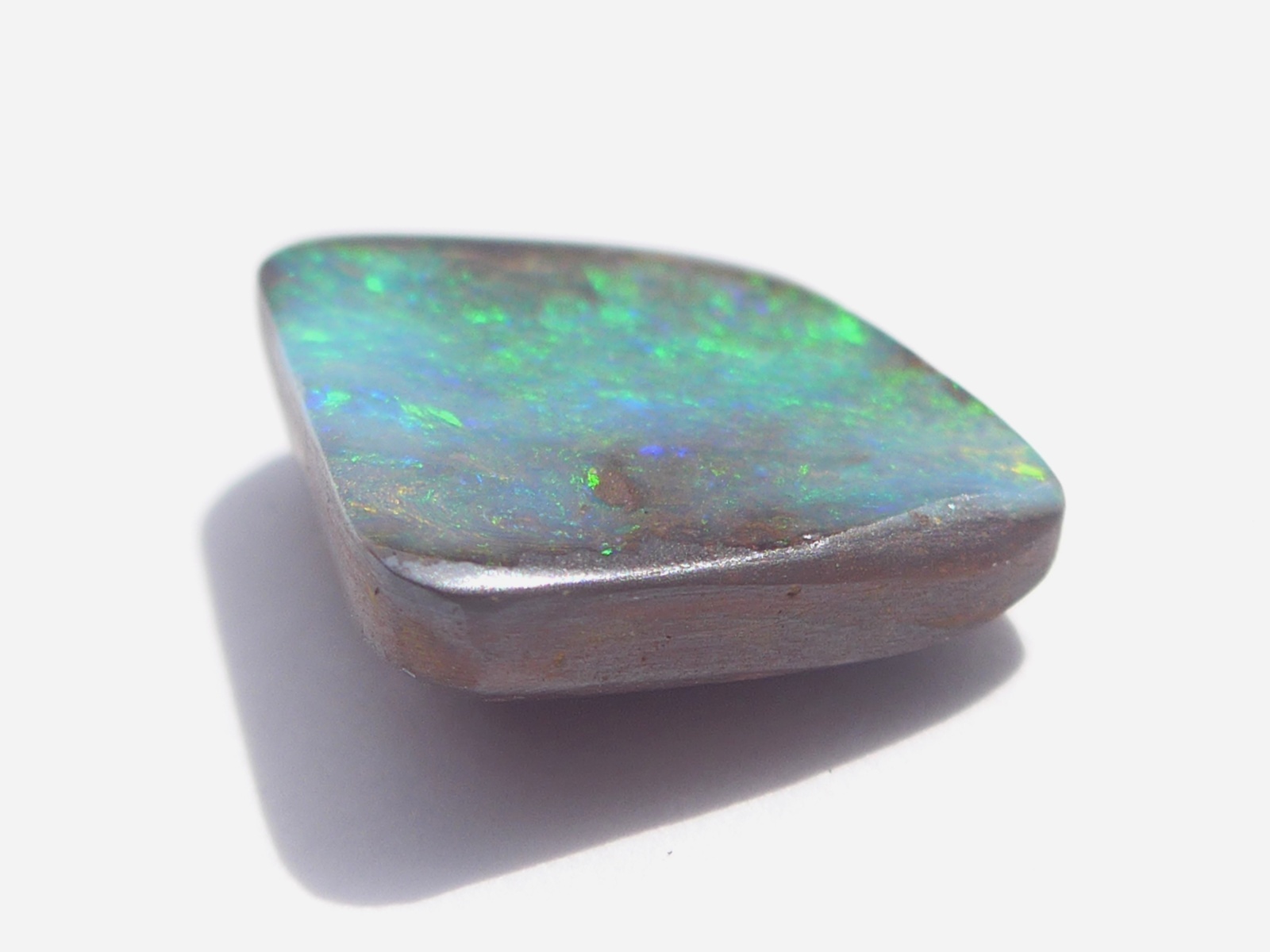 重さ3.07ct 大きさ11×8.5×3mm フリーシェイプオーストラリア、クイーンズランド州産ボルダーオパール青斑の中に斑が輝くオパールです。端に少しだけ母岩の鉄鉱石が見えて…